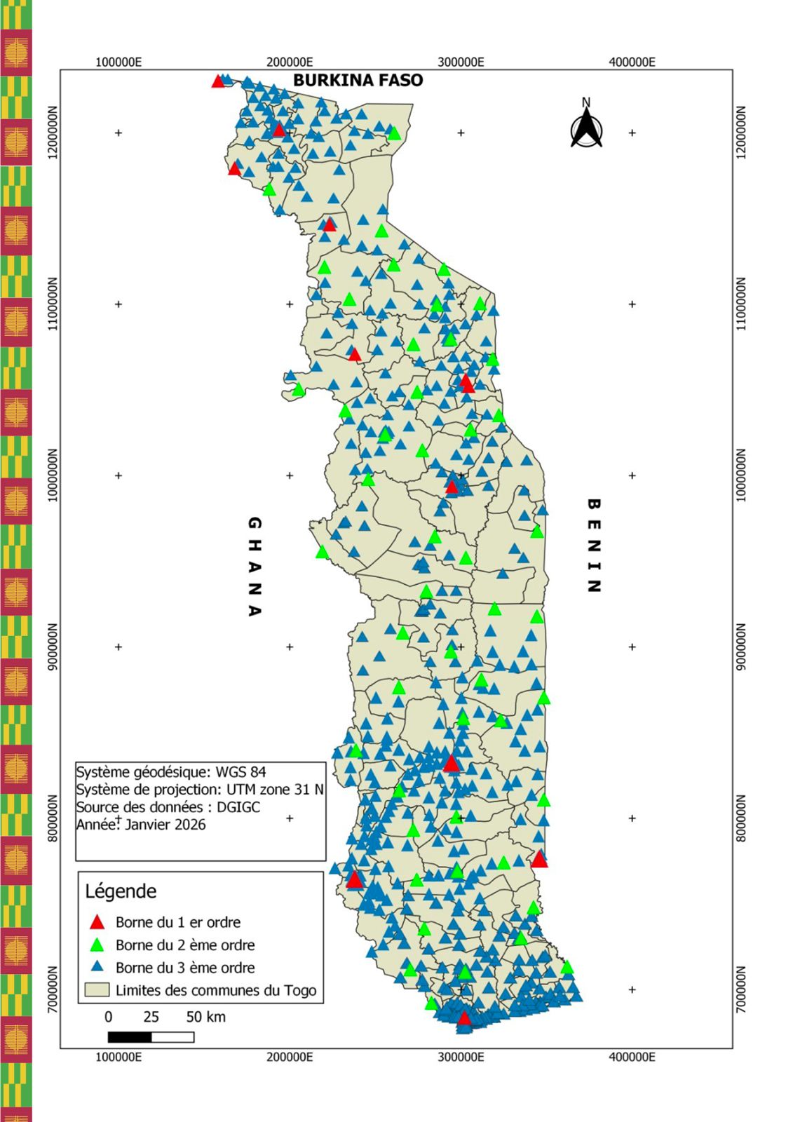 Dans le cadre de la modernisation des infrastructures géodésiques et géospatiales nationales et de la réforme du système d’information géographique conformément aux dispositions des articles 40 et 41 du code foncier et domanial, le ministère de l’aménagement du territoire et de l’urbanisme et le ministère des finances et du budget ont procédé au maillage du territoire national en bornes géodésiques et de nivellement ainsi qu’à l’installation d’un réseau de stations CORS.