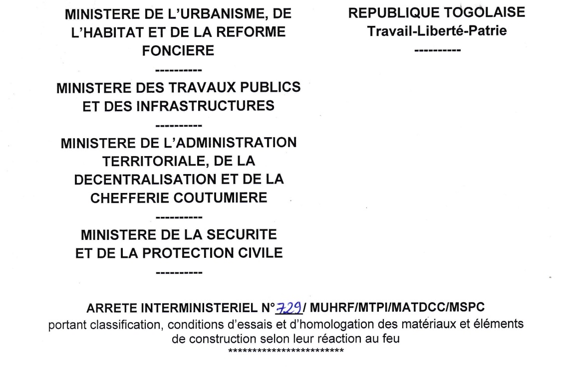 ARRETE INTERMINISTERIEL № 729/MUHRF/MTPI/MATDCC/MSPC portant classification, conditions d’essais et d’homologation des matériaux et éléments de construction selon leur réaction au feu