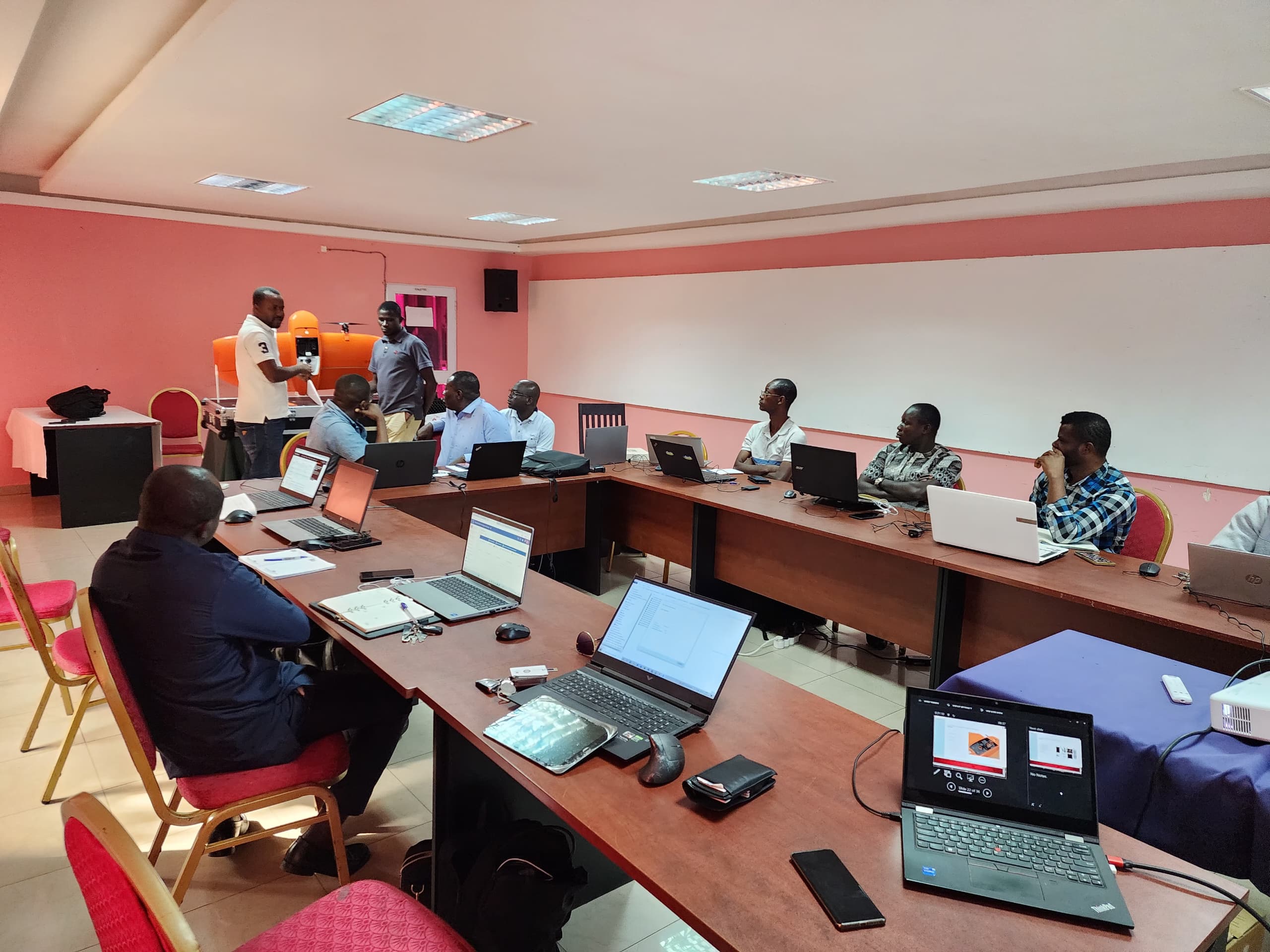 Durant cinq jours, les participants ont alterné entre enseignements théoriques et exercices pratiques portant sur la planification des vols, la mise en œuvre opérationnelle du drone, la sécurité des missions et le traitement photogrammétrique pour la production d’orthophotos et de modèles numériques de terrain.
